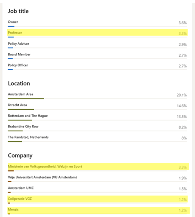 Ik ben geen statisticus maar heb wel gevoel voor cijfers. De nieuwe poll bevestigd wat de eerdere polls al zeiden: tussen de 80% en 90% van de respondenten vind het een groot probleem dat Nederland niet geïnformeerd wordt over de oversterfte. De uitslag is representatief. De doelgroep van de polls zijn mensen die betrokken zijn bij de zorg, mensen met verstand van zaken. ‘Oversterfte’ is geen gemakkelijk onderwerp en al helemaal niet sexy. Op twitter worden mijn tweets gezien door verschillende VWS-doelgroepen. Bij de verschillende polls op LinkedIn zijn steeds hoogopgeleide zorgwerkers gericht benaderd, waaronder verschillende personen met landelijke media bekendheid. De influencers van de gezondheidszorg, derhalve. Men weet ervan, dat de meesten niet willen stemmen is een probleem, maar doet niets af aan het belang van de uitslag. Zie ook de afbeelding van LinkedIn hierboven. De tabel geeft de achtergrond van stemmers op LinkedIn.