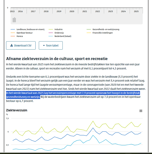 Het CBS schenkt ook in de publicatie van de 4e kwartaalcijfers 2025 van (gisteren) 17 februari 2026, nauwelijks aandacht aan het ziekteverzuim in de zorg. Maar wel aan de bedrijfstak ‘Cultuur, sport en recreatie’.