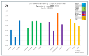Zojuist beluister ik – met stijgende verbazing – de podcast van NPO Radio1 van 14 feb. ’25, FEIT of FICTIE. Jos de Blok wordt geciteerd: “Nederland had tijdens de coronaperiode de grootste oversterfte van Europa!”. Men is dit gaan uitzoeken. De bijdrage van Prof. Anton Kunst (sociaal epidemioloog) is glashelder, daar valt niets op af te dingen. Maar Ruben van Gaalen slaat de plank ook hier weer mis. Hij zegt: “Nederland was qua oversterfte een middenmotor in Europa.” Let wel. Het is weinig zinvol om het over geheel Europa te hebben, want de verschillen in kwaliteit van zorgstelsels is enorm. Iedere zorgeconoom (en beoefenaar van aanverwante kennisgebieden) weet dat het alleen zinvol is om moderne, West-Europese landen onderling te vergelijken. Van Gaalen noemt landen als Roemenië en Bulgarije. Maar v.w.b. West-Europa beweert hij dat Portugal, Spanje, Italië en Engeland een hogere oversterfte hadden. Dit is pertinent onjuist, uitgaande van het geëxpliciteerde tijdvak 2020 t/m 2023.