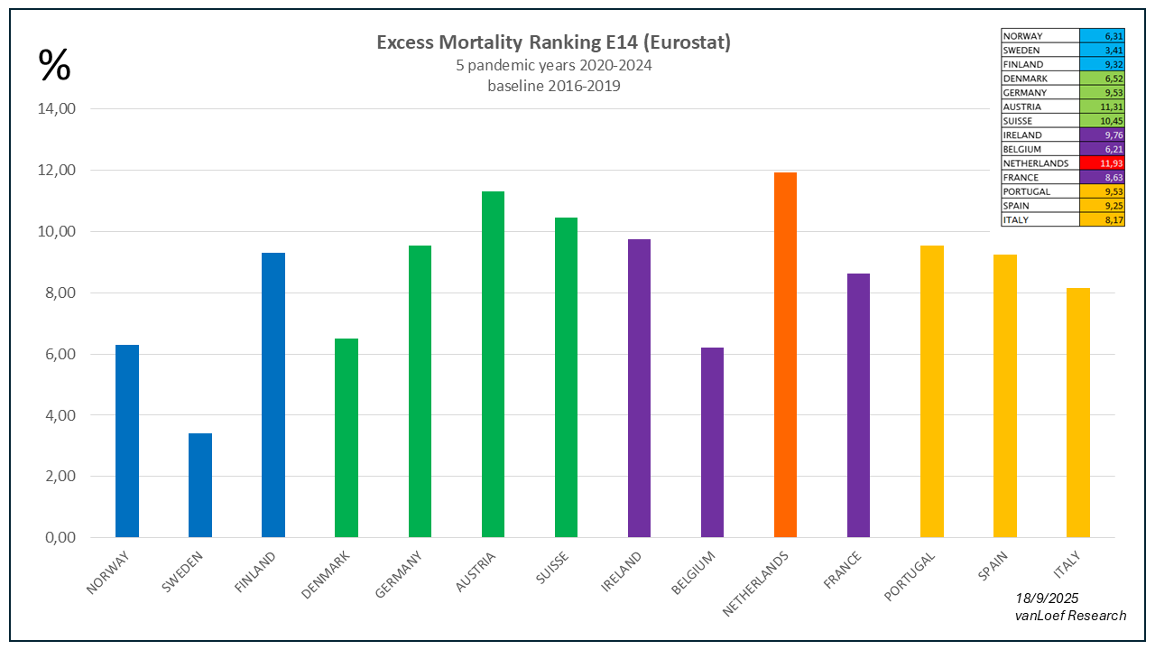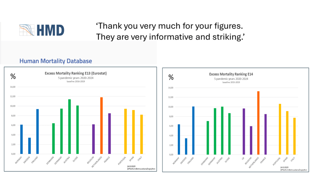 Ik citeer uit eigen bron: ‘De sterfte is in alle West-Europese landen lager dan in Nederland. Nederland is het enige land waar de oversterfte in 2024 nog 10% – 15% bedroeg (baselines @Eurostat en @Ourworldindata), in de andere landen – waar de vergrijzing meestal groter is dan 6,3% (NL) – is de (resterende) oversterfte aanzienlijk lager en soms zelf geheel verdwenen. Zie de grafieken Excess Mortality Pandemic Years 2020-2024. Kort gezegd, de grijze druk/vergrijzing is overal in West-Europa, maar nergens is de oversterfte aanhoudend zo hoog als bij ons.’ (Lees verder in:)