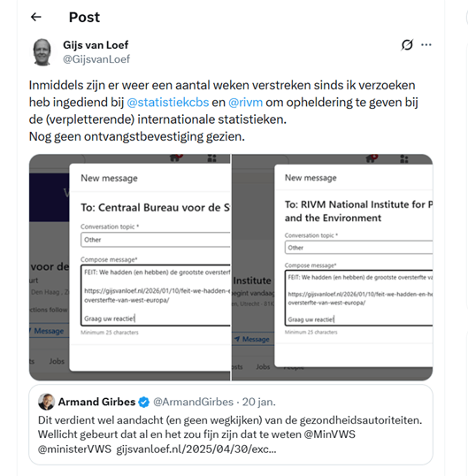 Inmiddels zijn er weer een aantal weken verstreken sinds ik verzoeken heb ingediend bij het CBS en het RIVM om opheldering te geven bij de (verpletterende) internationale sterftestatistieken. Nog geen ontvangstbevestiging gezien.
