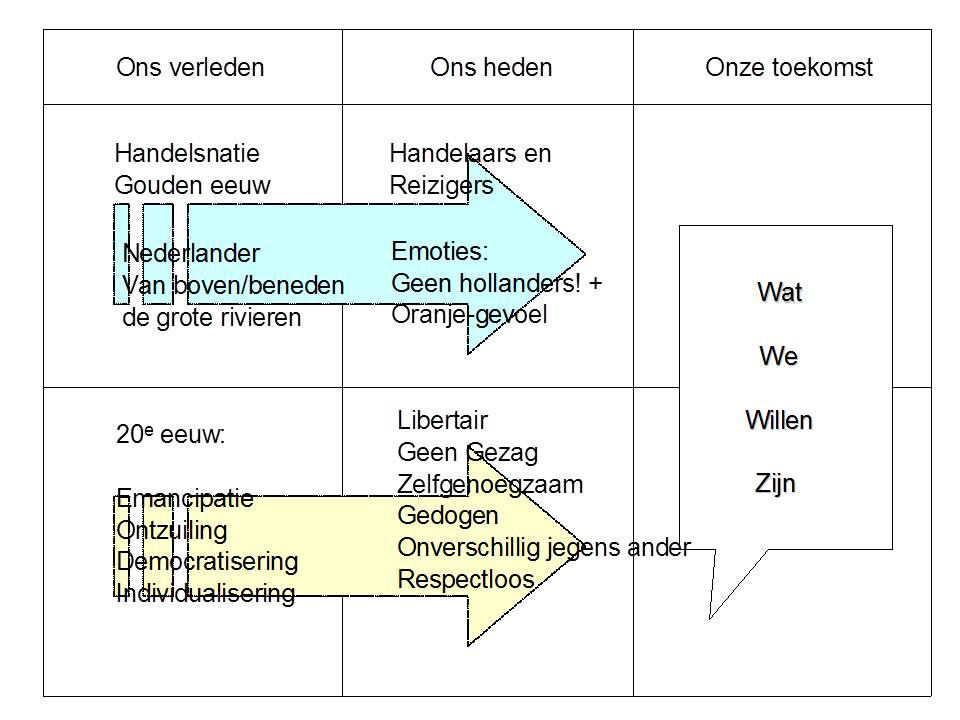 We hebben ook een gemeenschappelijk beeld van het soort samenleving dat we willen zijn. Met elkaar willen we ‘een wat meer gesloten samenleving, een samenleving met gevoel voor gemeenschapszin’(SCP), we willen een samenleving die ‘meer solidair is en meer bescheiden en minder materialistisch en minder behoudend’ (21Minuten.nl). We willen weer het gevoel krijgen dat we met elkaar iets hebben en we hebben gemeenschappelijke opvattingen over hoe we onze welvaart willen verdelen. We verlangen ook naar een herstel van zachte normen, van omgangsregels. Bij dit verlangen hoort, onvermijdelijk, gevoelsmatig een zekere mate van afwijzing van het vreemde. De globalisering is dan ook wat ons betreft te ver doorgeschoten. En van Europa hebben we de buik voorlopig helemaal vol.