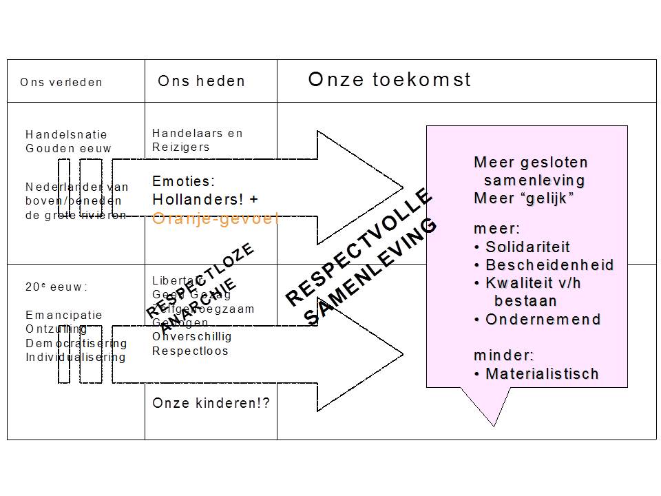 Anderzijds hebben wij Hollanders een mondiale blik. We zijn al eeuwen handelsreizigers en vliegen voor onze vakantiebestemming de wereld over. (Maar we komen elkaar in het buitenland liever niet tegen). Onze eigen geschiedenis en onze eigen culturele traditie, van Willem van Oranje tot WOII en van de Avonden tot het Europees voetbalkampioenschap van 1988, hebben ons gebracht tot daar waar wij nu staan. (Zie Thomas von der Dunk). We zijn allemaal vrij en iedereen is gelijk, maar in die overtuiging zijn we een beetje doorgeslagen. We zijn vergeten respect te tonen voor de ander. We zijn een Respectloze Anarchie.