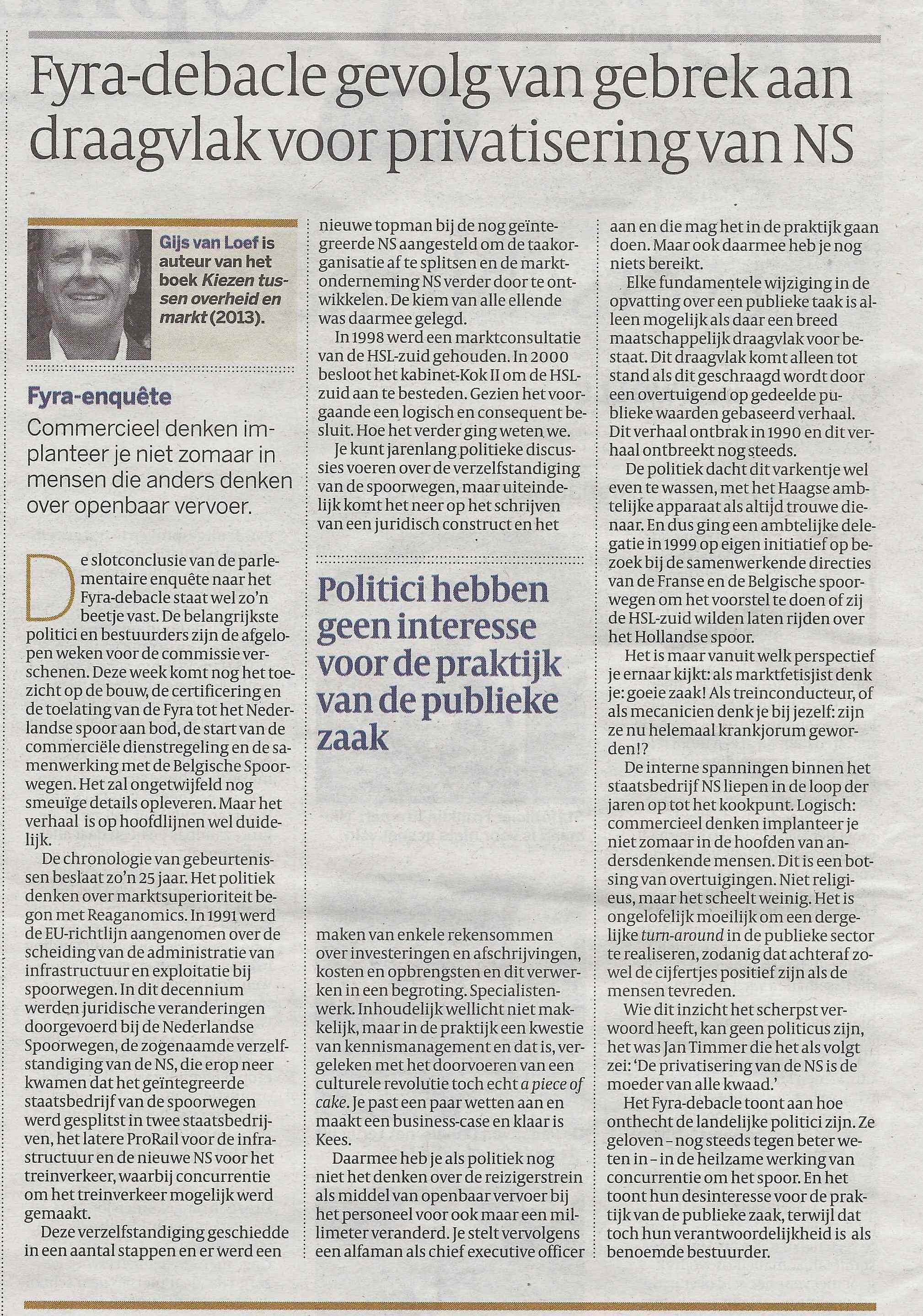 Het Fyra-debacle toont de onthechtheid van landelijke politici aan, die nog steeds tegen beter weten in geloven in de heilzame werking van concurrentie om het spoor. En het toont hun desinteresse voor de praktijk van de publieke zaak, die hun verantwoordelijkheid als benoemde bestuurder is.
