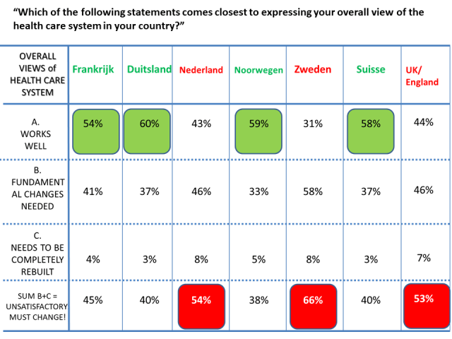 6e – De bevolking in Zweden (66%), Nederland (54%) en het Verenigd Koninkrijk (53%) is in meerderheid ontevreden over het eigen zorgstelsel en wil fundamentele veranderingen. De bevolking in Duitsland (60%), Noorwegen (59%), Zwitserland (58%) en Frankrijk (54%) is in meerderheid tevreden over het eigen zorgstelsel. bron: CMWF, 2017.