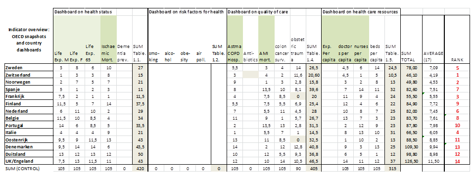 Dit geeft tenslotte de volgende tabel op basis van het OESO-dashboard, met geheel rechts de uiteindelijke ranking in rood: