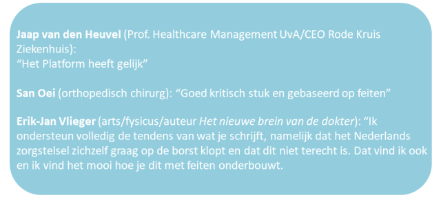 - Het ministerie van VWS doet geen systematisch onderzoek naar de kwaliteit van het zorgstelsel, er wordt geen empirische basis opgebouwd. Er is geen tegenwicht voor de door belangen gedreven hype-achtige beeldvorming in de media.