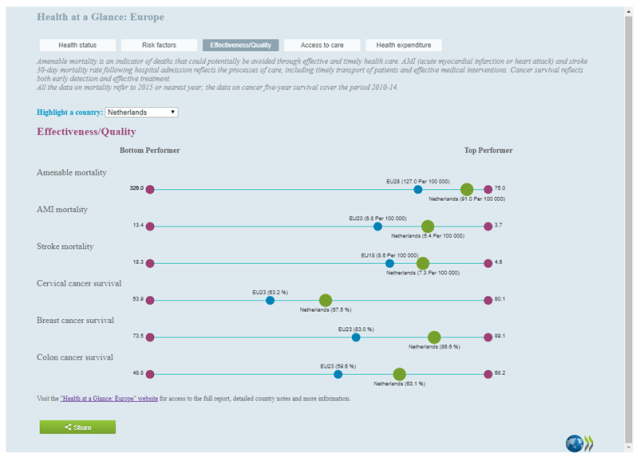 12. In vergelijking met het buitenland hebben wij een goed zorgstelsel. Kunnen er dingen beter? Tuurlijk. Maar ons stelsel is heel solidair, heel toegankelijk en kwalitatief hoogstaand. – Uit mijn onderzoek blijkt dat het Nederlands medisch zorgstelsel o.b.v. beschikbare kwaliteitsindicatoren relatief iets slechter presteert dan het gemiddelde europese zorgstelsel (vergelijking data van 14 moderne landen). Private zorgstelsels (zoals het Nederlandse) zijn duurder dan publieke zorgstelsels, terwijl de kwaliteit over het algemeen genomen vergelijkbaar is. Zoals we allemaal weten is het private zorgstelsel van de USA zo’n beetje het duurste in de wereld. OECD Health at a Glance 2007 2017 EU14
