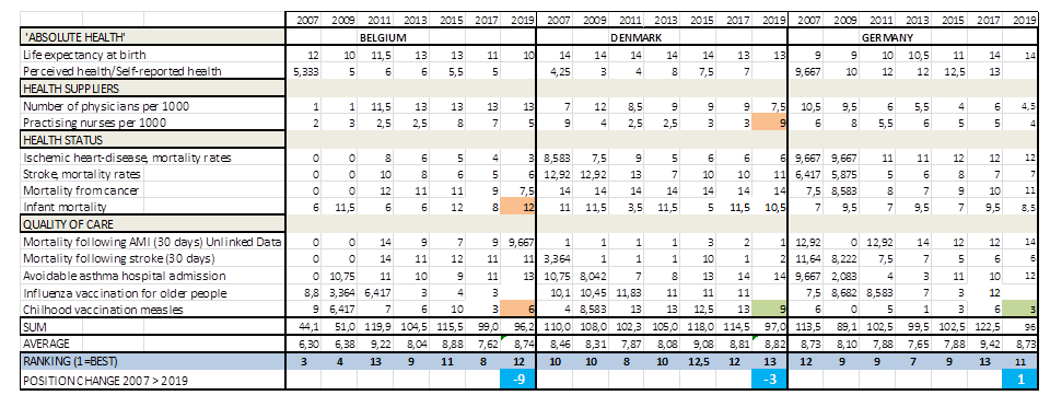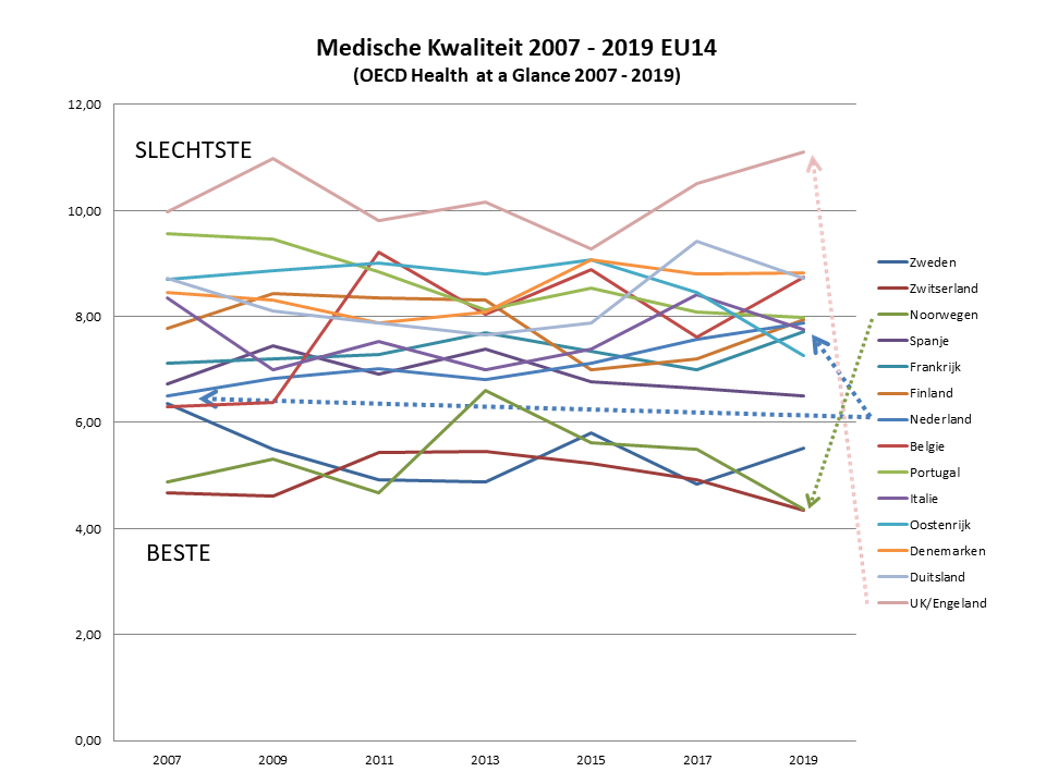 De recente analyse van de HAQ-index (EU14) en de Healthy Life Years (EU14) ondersteunt de bevindingen v.w.b. de geleidelijke achteruitgang van de kwaliteit van de medische prestaties in internationaal opzicht. Bronnen: