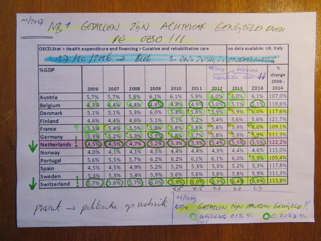 De kosten-data (%BNP/GDP zijn door de OECD op meerdere momenten na publicatiedatum (opmerkelijk genoeg!) gecorrigeerd. De grootste correcties betreffen de data van Zwitserland en Nederland. Zie> stats.oecd.org . Gevolg is dat de blauwe kostenlijn van de grafiek een andere kromming heef gekregen. De foto van mijn aantekeningen illustreert die wijzigingen: