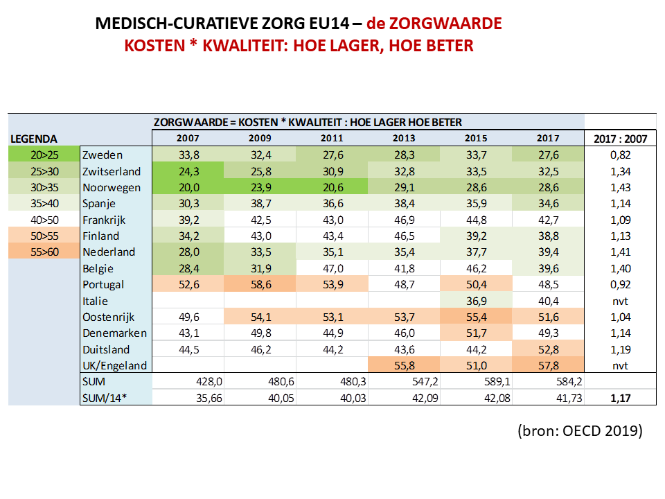 Indien de kwaliteit en de kosten met elkaar vermenigvuldigd worden ontstaat een indicator (‘Zorgwaarde’) van de kostprijs van de (totale) curatieve zorg. De zorgwaarde, dus de prijs van de zorg, is sinds 2007 het sterkst gestegen in Nederland en België (en Noorwegen, dat de op een na laagste totaalscore heeft). Dit betekent dat de curatieve zorg in deze twee landen steeds duurder wordt in vergelijking met de twaalf andere landen. Tabel: