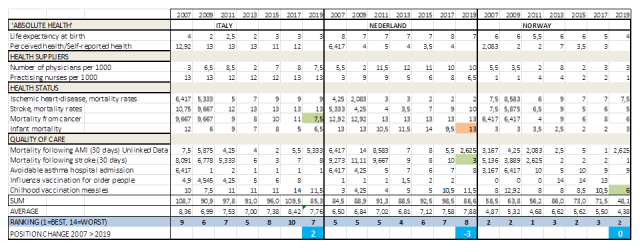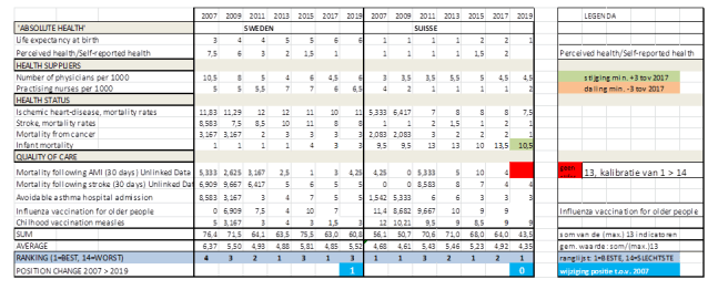 Een positief punt v.w.b. Nederland is de recente verbetering van de resultaten bij cardiovasculaire aandoeningen (Stroke, Ischemic heart-disease). De datatabel: