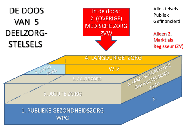 Deze illustratie roept – denk en hoop ik – vooral vragen op. Zoals: Als de overheid vrijwel de gehele zorg financiert (hetzij direct dmv. belastingen, hetzij afgedwongen dmv. verplichte premies; nuance: met stijgende additionele eigen betalingen) en ook vrijwel de gehele zorg organiseert (regisseert)… wat doen die zgn. ‘zorgverzekeraars’ (die alle problemen afwentelen op de staat, cq. de patiënt) daar eigenlijk überhaupt nog? De vraag onbeantwoord laten, kabinet en heren ministers, is wellicht politiek opportuun maar – laten we wel wezen – onverantwoord (kosten bureaucratie!) en immoreel (uit menselijk oogpunt).