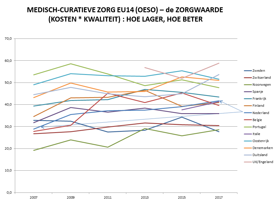Bij cruciale indicatoren als de levensverwachting bij geboorte en het aantal jaren in goede gezondheid doet Nederland het net als de meeste genoemde europese landen goed, alleen langzaam maar zeker wel een tikkeltje minder goed dan een aantal anderen. Ergo: Niet ‘de zorg stort in’, maar nuance, beste Joost.
