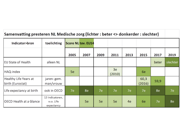 Op alle serieuze ranglijsten (OECD Health at a Glance, Healthcare Access and Quality Index, EC/EU/Eurostat) is de relatieve achteruitgang van de Nederlandse medische zorg ten opzichte van de EU14 terug te zien.