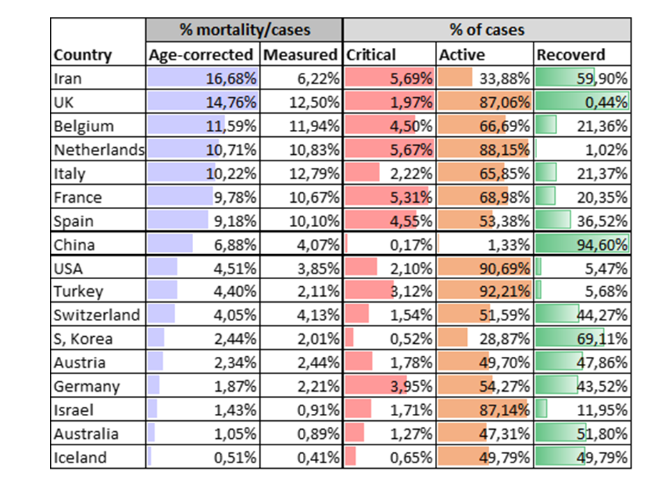 2) Niet ieder land heeft dezelfde bevolkingsopbouw. Sommige landen hebben een oude bevolking en oude mensen sterven relatief vaak door COVID-19. Ook daarvoor kan worden gecorrigeerd.