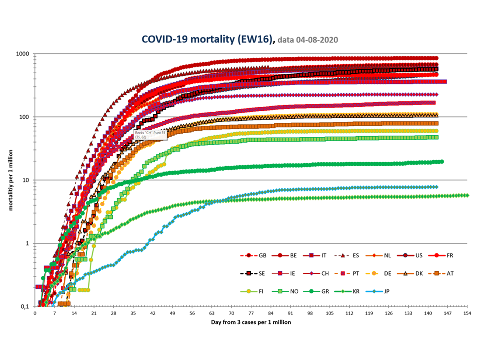 The Corona Dashboard 1.0 was launched in Dutch at 18th of April 2020 on our websites. It focused at the EW16, 16 ‘modern’ European countries with a population of at least 4 million people. These countries share political, democratic, social economic and technological development, making them excellent for internal comparison. The list consists of Austria, Belgium, Denmark, Germany, Finland, France, Greece, Ireland, Italy, the Netherlands, Norway, Portugal, Spain, Sweden, Switzerland and the United Kingdom. Japan, Republic of Korea (South) and the USA are added to complete the list, therefore EW16+3.