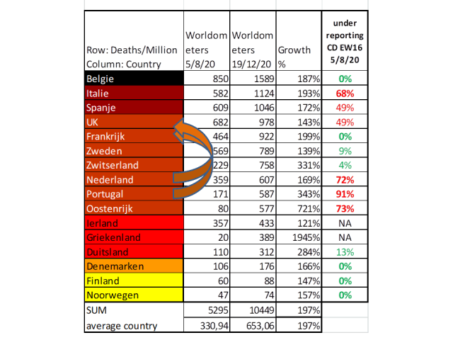 Wat opvalt: Landen met onderreportage (Tabel> rechterkolom) hebben tot nu toe een qua dodental ernstiger verloop van de 2e golf, dan landen zonder onderreportage (de Scandinavische landen en Duitsland). De werkelijke verschillen tussen beide groepen landen (grafieken 1 en 2, let op de verschillende Y-assen) zouden wel eens nog groter kunnen zijn.