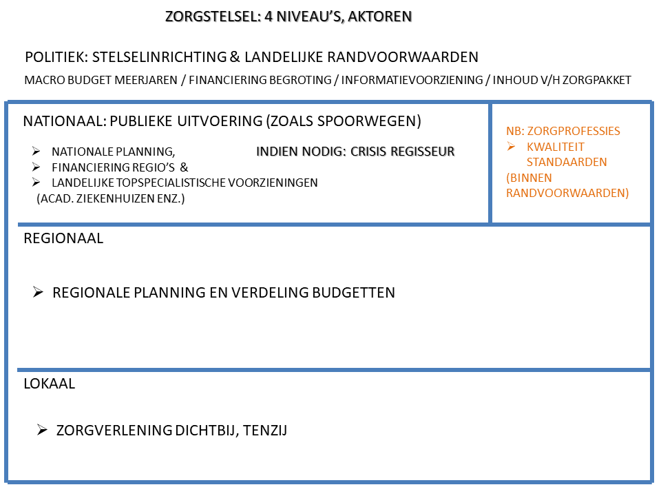 H In een zorgverzekeraarsmarkt bestaat een blinde vlek voor centrale planning van landelijke zorgvoorzieningen en centrale randvoorwaarden (zoals ICT-standaarden). Zorgverzekeraars hebben deze regisserende rol als marktmeester, maar kunnen dit natuurlijk nooit waarmaken. Veel zorgvoorzieningen (organisatorische eenheden van samenwerkende zorgverleners) staan onder druk en verdwijnen (spoedeisende hulp, kleinere ziekenhuizen, specialistische ggz) en vooral ook in de periferie buiten de Randstad. Het plotselinge faillissement van de ziekenhuizen is een voorbeeld van dit marktfalen.