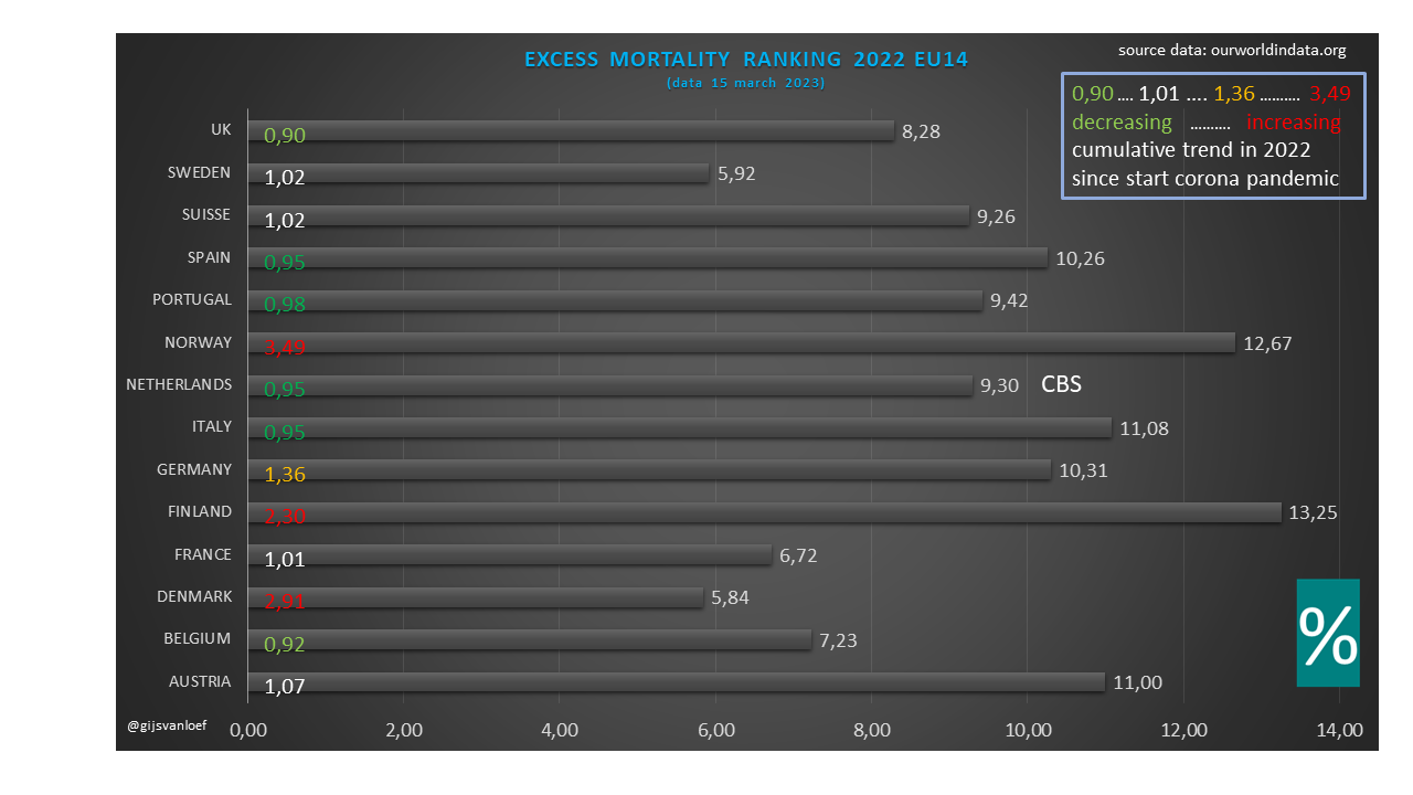 De twee noord Scandinavische landen zijn begin 2022 voor het eerst getroffen door een majeure besmettingengolf, die de hoge oversterfte in 2022 verklaard. Voor Oostenrijk geldt dat de bevolking qua consumptieve gewoonten zo ongeveer het minst gezond is van alle EU14 landen, Oostenrijkers scoren slecht qua (ischemische) hart- en vaatziekten, een belangrijke doodsoorzaak bij coronainfectie. (3b)
