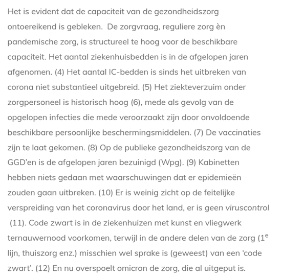 Het zorginfarct is een jaar geleden begonnen. In het 4e kwartaal 2021 ging Nederland als enig westeuropees land opnieuw in een lockdown, omdat de capaciteit ontoereikend was geworden, mede door het historisch hoog (all-time high, zie CBS) ziekteverzuim onder zorgverleners bij een toch al uiterst beperkte opvangcapaciteit in de ziekenhuiszorg (algemeen bekend). Het afgelopen jaar heb ik aspecten van het zorginfarct belicht op mijn website. De opvallend hoge, structurele oversterfte in Nederland is de pijnlijke ultieme uitkomstmaat van het zorginfarct.