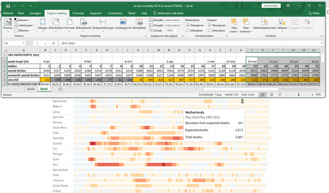 Wetende, dat er altijd correcties van sterftecijfers achteraf zijn bij elk land (met de UK als toonbeeld van voorspelbaarheid, systematisch minimale correcties met terugwerkende kracht en Italie als notoire ‘achterloper’ van recente data), correcties die varieren en kleiner worden naarmate het langer geleden is, is het vaste patroon van de plotsklapse wijziging van de Nederlandse data die helemaal terug gaat naar week 1/22 hoogst opmerkelijk. Het klopt niet. Het kan gewoon niet. Ergens in dit dataproces is gerommeld. (met de brongegevens van het CBS)
