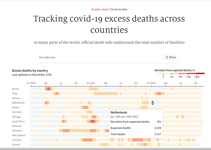 In de laatste internationale statistieken van de excess mortality zien we een hoogst opmerkelijke wijziging van de Nederlandse cijfers (ourworldindata.org; economist e.d.). Het zou erop neerkomen dat de oversterfte op jaarbasis in een klap met een factor 3,5 kleiner wordt. Dat is natuurlijk niet waar. Maar hoe komt dit?
