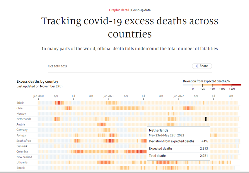 Tot en met het eind van 2021 lopen de cijfers van The Economist in pas met het CBS. Vanaf 2022 zijn de wekelijkse verschillen tussen The Economist en het CBS opeens systematisch heel groot, statistisch onmogelijk?! Doortellend t/m 2 oktober 2022 (week 39) komt The Economist op een absolute oversterfte van 3.355 doden in 2022, terwijl het CBS op 7.338 komt, meer dan 2 x zoveel (219%)?! (zie tabel, rechts)