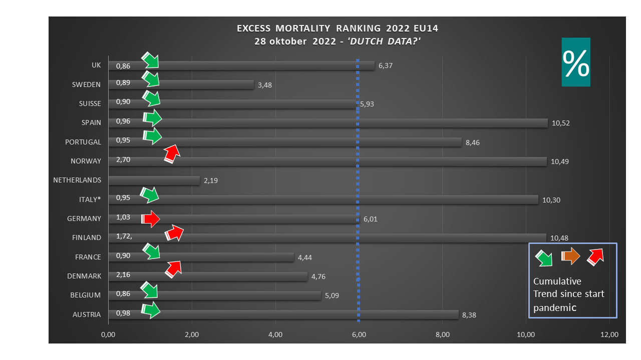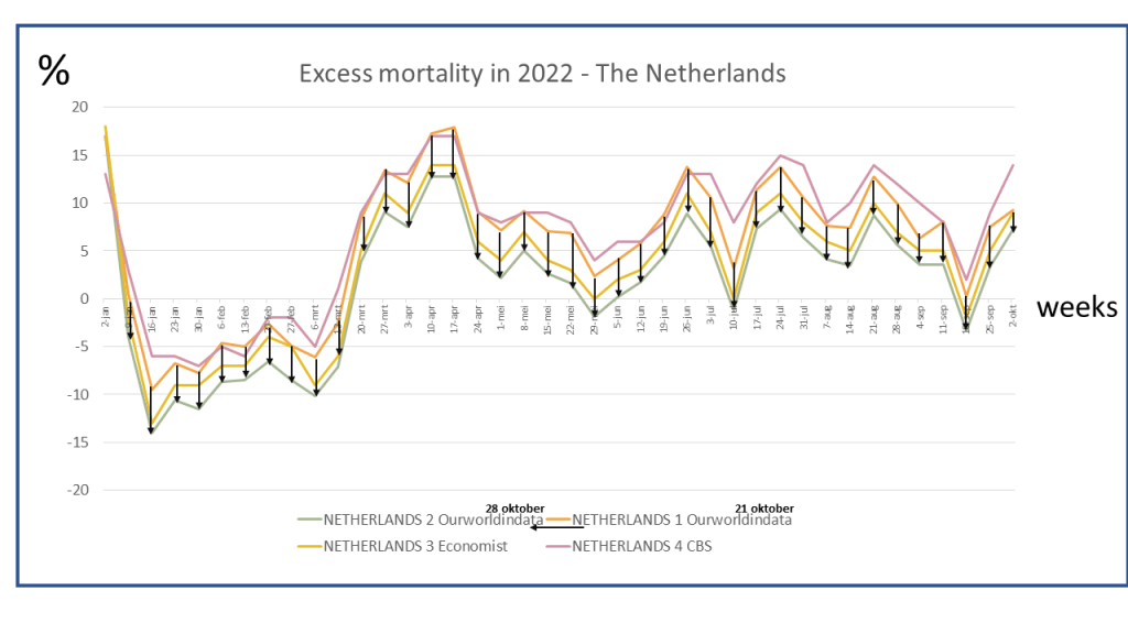 De nederlandse cijfers zijn opeens vanaf week 1 2022 zeer sterk verlaagd. Tot en met de laatste meting (week 39, de laatste week die vergeleken kan worden) zijn de oversterfte percentages van Nederland 3,5 keer kleiner geworden, rekenkundig een verlaging van 100% (oude totaal=100%) naar 28,93% (nieuwe totaal). Bij alle landen zijn de verschillen tussen beide lijsten, verschillen die het gevolg zijn van normale mutaties achteraf die bij alle landen voorkomen, kleiner dan 5% (4 landen rond de 4% a 5%: Duitsland, Spanje, Italie, Zwitserland), bij 9 van de 14 landen is het verschil kleiner dan circa 1,5%, waarvan bij 7 landen de verschillen volstrekt minimaal zijn.