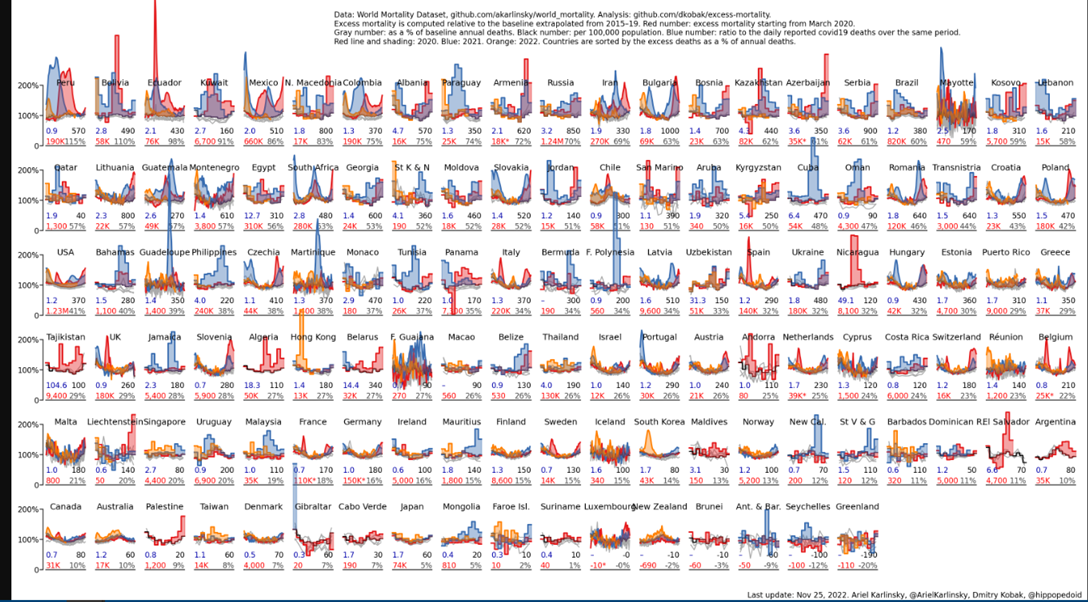 Uitgangspunt zijn de cijfers van het CBS. Zoals al eerder werd opgemerkt, is er iets vreemds aan de hand met de cijfers van Nederland vanaf 2022 in de wereldwijd toonaangevend bronnen The Economist en Ourworldindata (zie grafiek gepubliceerd op 6 nov.). In eerste instantie betreft het een analyse van Ourworldindata, de excess mortality percentages. Een verzoek aan Ourworldindata om opheldering brengt ons niet verder (zie email). Er is contact gezocht met de World Mortality Dataset.