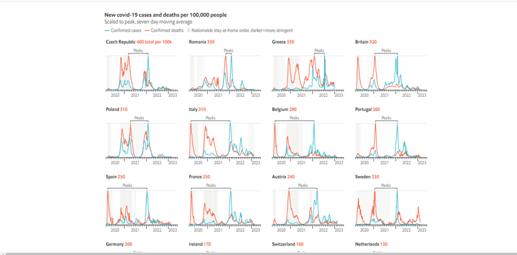 Hier de vier versies van Nederland: 2 versies ourworldindata (data 28/10, data 21/10), de CBS-versie en de The Economist-versie. NB De CBS-versie (paarse lijn) ligt het hoogste, daaronder de oude versie van ourworldindata die de CBS-grafiek regelmatig raakt. Daaronder (okergele lijn) de The Economist versie en onderaan de nieuwe ourworldindata-versie (grijze lijn). NB Bij de andere landen (EU14) is er vrijwel geen waarneembaar verschil tussen de verschillende ourworldindata-versies en dat is logisch (28/10 versus 21/10).