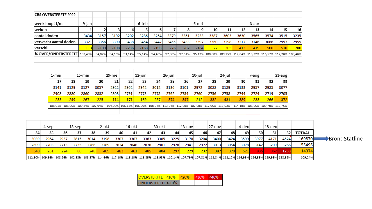De cijfers van 2020 en 2021 komen van Ourworldindata. Jaartotalen CBS (afgerond, niet exact). De cijfers van 2022 zijn gebaseerd op CBS en Statline (jaartotaal: 169.870) en worden wekelijks bijgehouden in excel en gepubliceerd op mijn website, sinds het begin van de ononderbroken periode van oversterfte medio maart 2022. Procesmatig bestaat er een duidelijk patroon, waarbij wekelijkse sterftecijfers achteraf opgehoogd worden en dit gedurende enkele maanden. Dit is logisch. Alleen de laatste week52 (6 dagen) kent nog een grote onzekerheidsmarge. Uitgegaan is van het jaartotaal op https://lnkd.in/eBsDy7X4 .