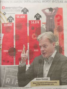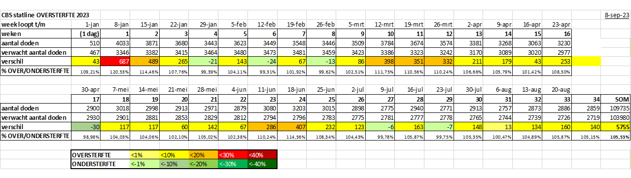 update 22 september 2023 – De oversterfte neemt weer toe. Er zijn nu dit jaar 6.1277 meer mensen overleden dan verwacht, dat is 5,6%.