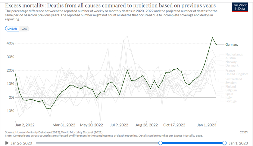 8 februari – update ourworldindata toont dramatische sterftecijfers in Duitsland. De kop van de blog houdt met de kennis van vandaag: 8 februari, de dag waarop ourworldindata nieuwe cijfers publiceert van de excess mortality, geen stand.