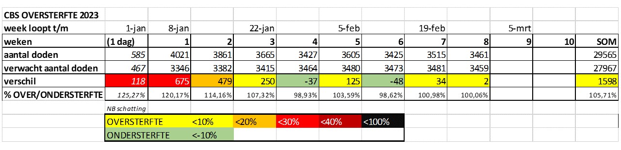update 3 maart – cijfers CBS t/m week 8. Sterfte fluctueert rondom de te verwachten lijn. In de eerste twee maanden van 2023 is er een oversterfte van ca. 5,7%, dit zijn ca. 1.600 sterfgevallen.