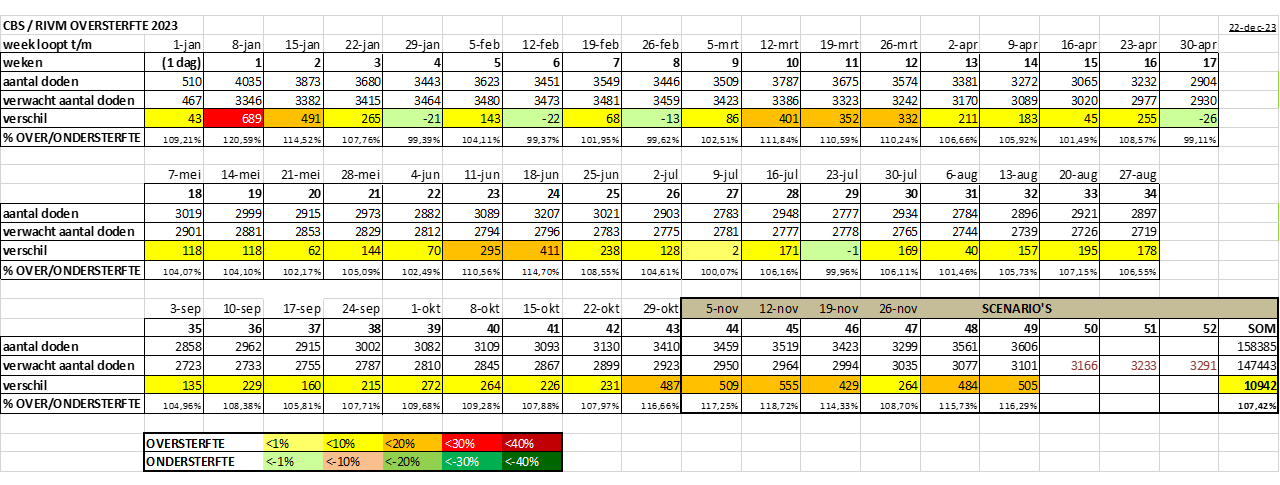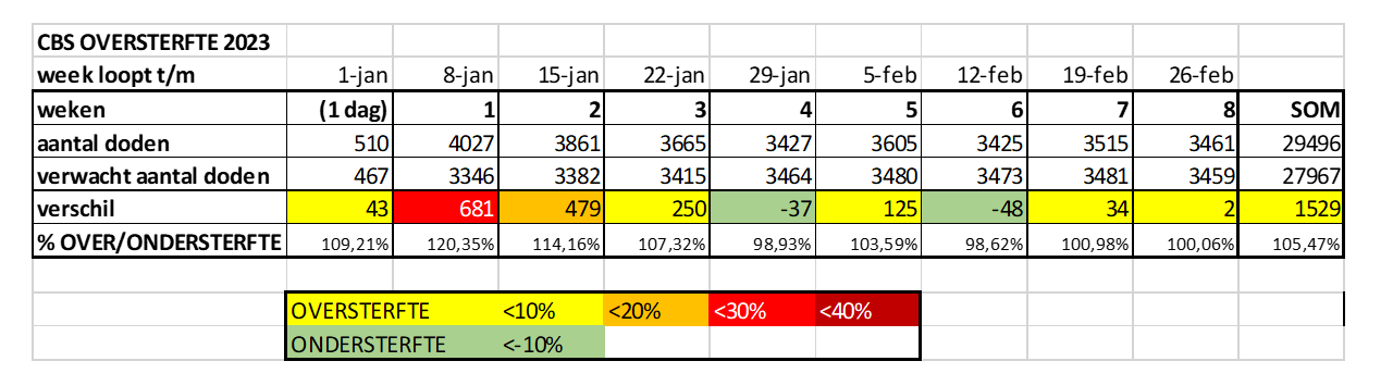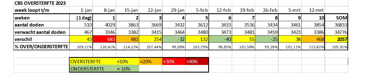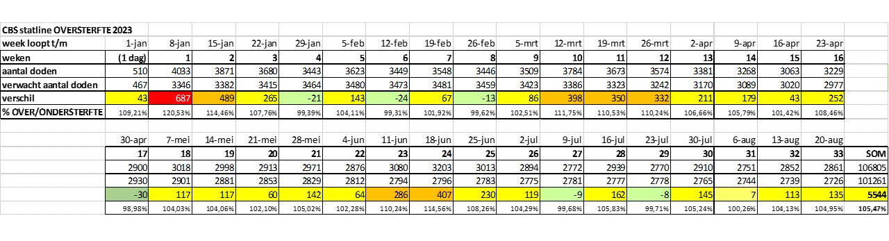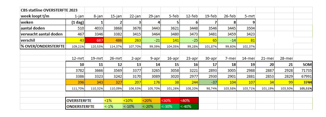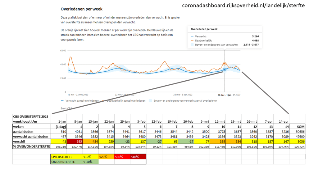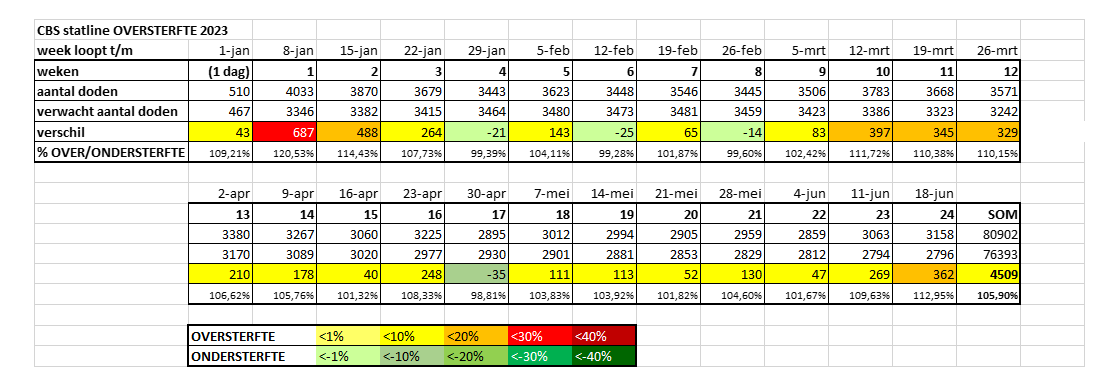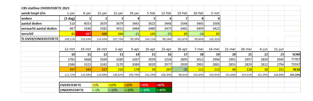 update 23 juni – Eerste prognose week 23: oversterfte van 9% (!). Plusmutaties terugwerkend tot begin van 2023. Oversterfte in 2023 stijgt naar 4.110 doden, een hoger sterftepercentage op jaarbasis (5,58%). Beeld: verslechtering.
