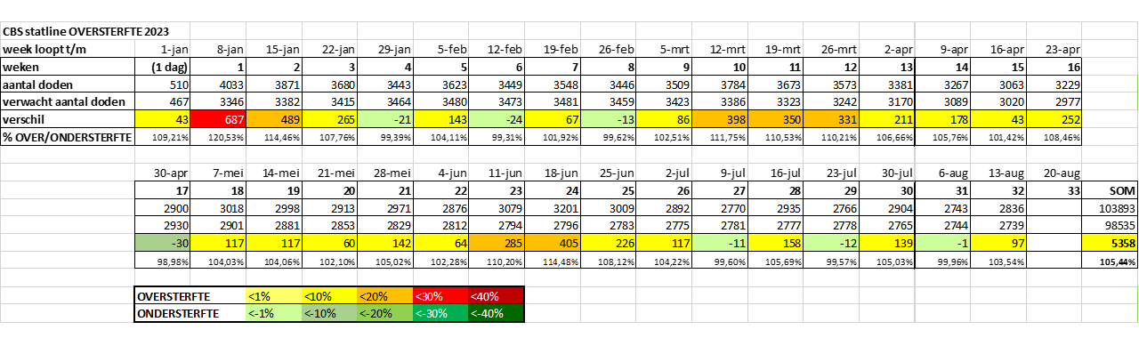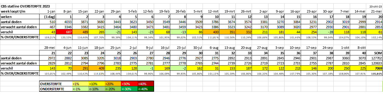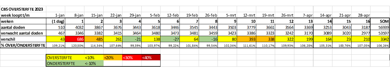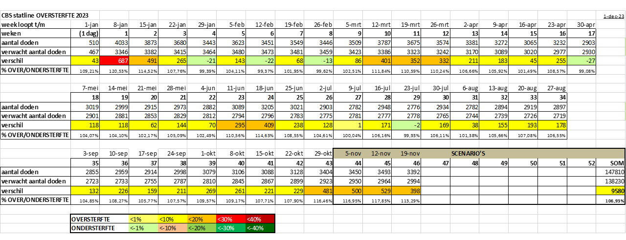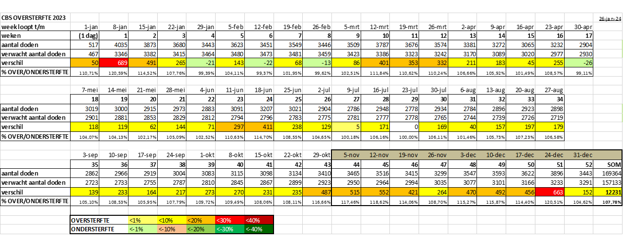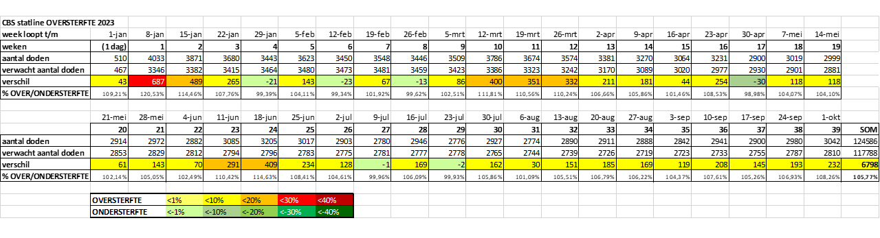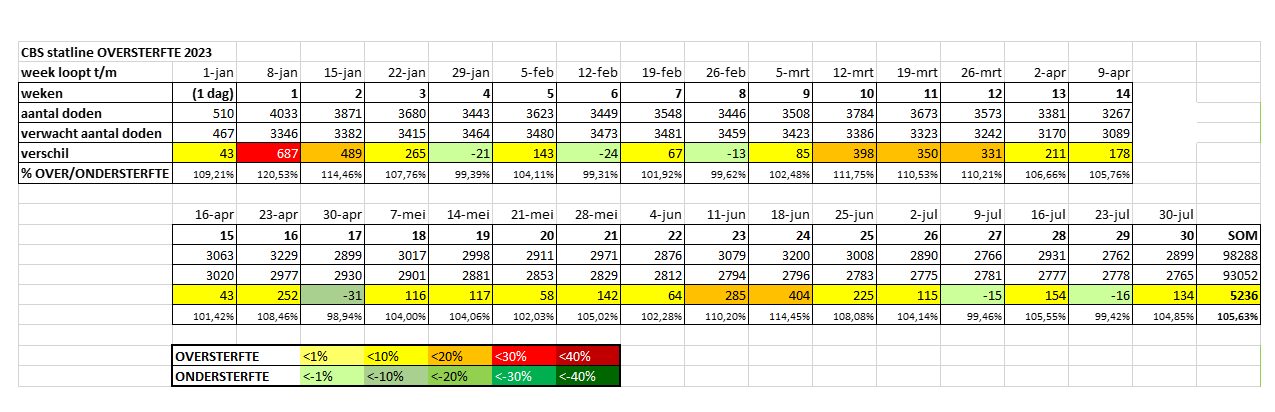 Op basis van CBS-data maak ik net als het afgelopen jaar een tabel van de sterfte/oversterfte/ondersterfte dit jaar. Zoals u weet houd ik geen rekening met de (wekelijkse) bandbreedtes, teneinde een scherper beeld van de actualiteit te krijgen. Het genuanceerde beeld ontstaat vanzelf. Suggesties zijn altijd welkom.