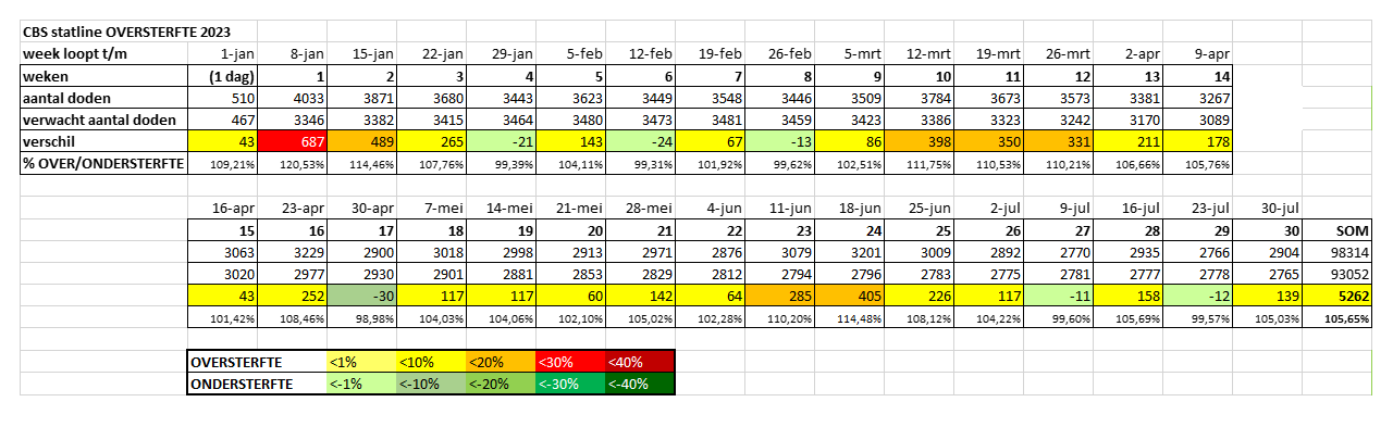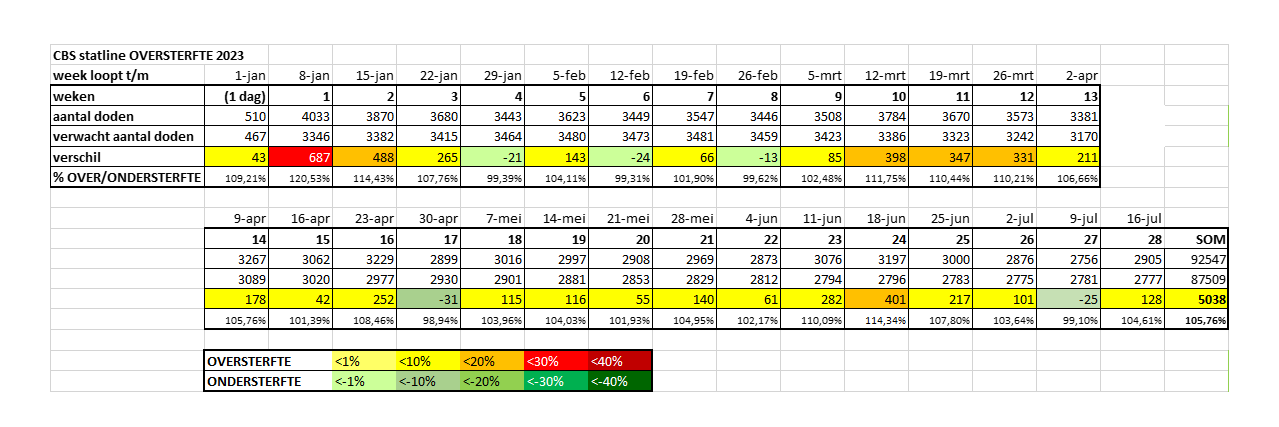 update 7 juli – De oversterfte is nu 6%. Het gaat om 4.748 mensen die te vroeg gestorven zijn. Op jaarbasis zou dit kunnen uitkomen op ca. 9.500 doden in 2023.