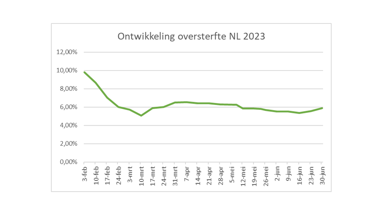 update 30 juni – Nieuwe oversterftegolf: prognose 13% in week 24. Oversterfte in 2023 stijgt verder, zowel absoluut (4.509 doden), als procentueel (5,9%). Beeld: verdere verslechtering.