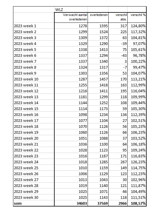 1 september – Onder WLZ-zorggebruikers is de oversterfte verhoudingsgewijs aanzienlijk groter. Tot en met week 30 zijn er 2.966 mensen meer gestorven dan verwacht, dit komt overeen met een oversterfte van 8,57%. In dezelfde periode was de totale oversterfte 5.246 (5,67%). Het aandeel van de oversterfte onder WLZ-zorggebruikers op de totale oversterfte is dus 2966/5246 = 56,5%. Er zijn in totaal ongeveer 340.000 mensen met een WLZ-indicatie (bron: google).