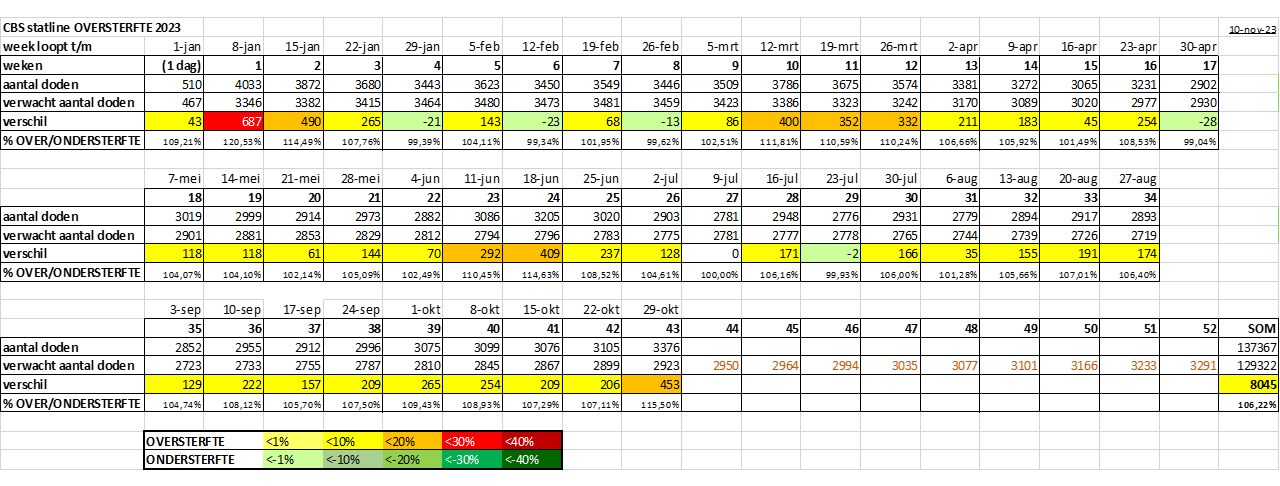 update 3 november 2023 – De oversterfte neemt verder toe. Het totaal aantal mensen dat te vroeg is overleden is volgens de nieuwste cijfers nu 7.549, dat is 5,97%.