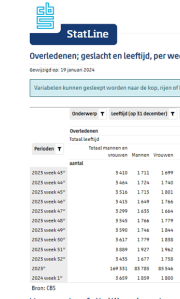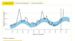 NB CBS verandert haar publicatiebeleid (lagere frequentie). Quote: ‘De cijfers zullen nog steeds wekelijks verschijnen, maar CBS geeft geen schatting meer over de afgelopen week. Daarnaast zal CBS nieuwsberichten over sterftecijfers niet meer per maand publiceren, maar per kwartaal.’
