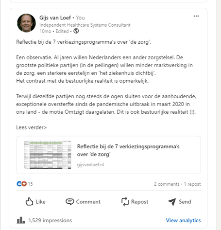 Deze kloof blijkt ook uit de rol die de huidig demissionair minister VWS Ernst Kuipers speelt als ‘verandermanager van de zorg’. Het problematische is onder meer, dat sommige journalisten met een groot publiek bereik (influencers), zoals Jort Kelder bij Op1, zonder blikken of blozen het bestuurlijke frame blijven herhalen… Ook problematisch is dat de politieke partijen in de verkiezingsprogramma’s wel degelijk de stem van de bevolking horen (ze schrijven het op), maar dat er weinig van overblijft als er politieke coalities moeten worden gesmeed. Zo leert de politieke geschiedenis.