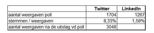 Er zijn opvallend weinig stemmen uitgebracht. Op twitter heeft 8,33% een stem uitgebracht, op LinkedIn een schamele 1,58%. De twee polls hadden een ‘bereik’ van 1704 weergaven (Twitter) en 1267 weergaven (LinkedIn). Op twitter steeg het aantal weergaven na de poll tot boven de 3000.