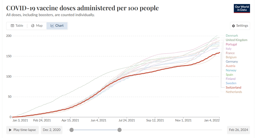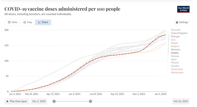 b. cumulatief aantal vaccinaties in 2021 (boven: alle landen; onder: Nederland, Oostenrijk, Zwitserland, Duitsland)