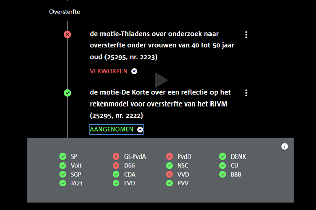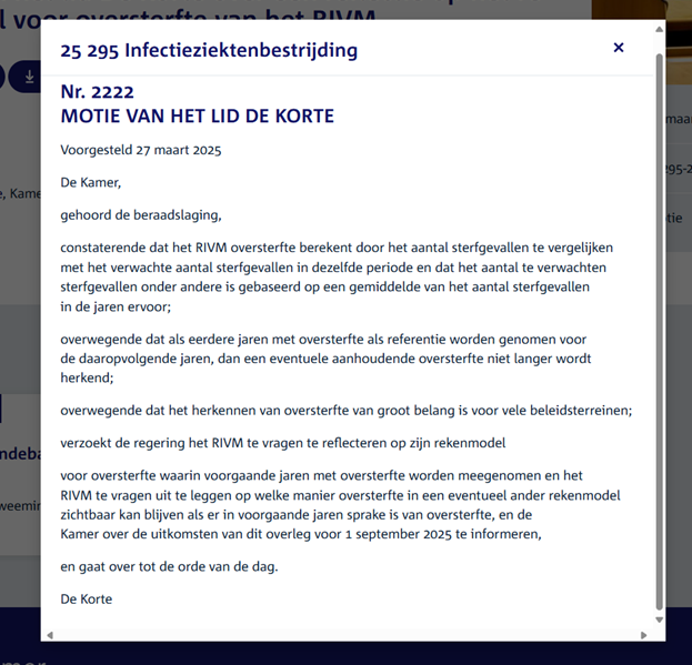 De oversterfte (sinds covid19) weerspiegelt de kwaliteit van de gezondheidszorg van landen. De Levensverwachting bij geboorte is volgens de zorgwetenschap de belangrijkste indicator (Key Performance Indicator) van de kwaliteit van de gezondheidszorg in een land. Hoge oversterfte correleert met een dalende levensverwachting. Nederland is het enige land waar de levensverwachting daalt sinds covid19. De oversterfte is met andere woorden, ongeacht de precieze oorzaken (denk aan onder meer: lage vaccinatiegraad; ondercapaciteit 1e lijn; te weinig geneesmiddelen; etc.) een harde indicator van een falend zorgstelsel.