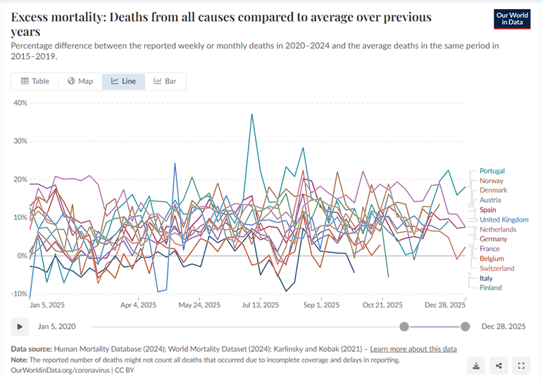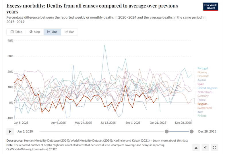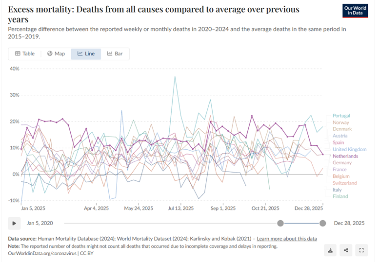 Geen nieuwe cijfers Nederland: 13,86% oversterfte in 2025. Ruim drie procentpunten meer dan Portugal, dat met 10,7% de op een na hoogste oversterfte heeft en dat deze zomer geteisterd werd door hitte en bosbranden. NB Relatief hoge oversterfte in de drie Scandinavische landen Noorwegen, Finland en Denemarken. NB2 Het Verenigd Koninkrijk – waar ook een zorginfarct heerst – heeft een respectabele oversterfte van ‘slechts’ 7%. De NHS-cijfers zijn vanaf eerste publicatiedatum uiterst betrouwbaar.