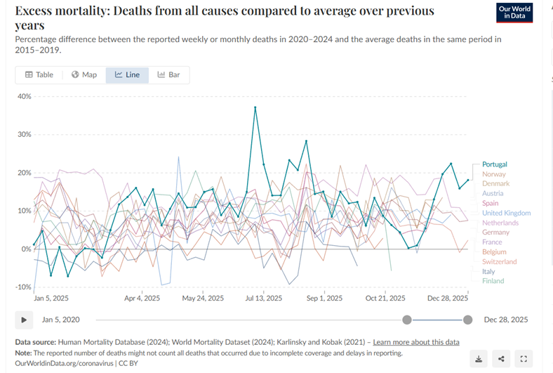 In 2025 ‘scoort’ NL ca. 13,5% oversterfte (baseline 2015-2019), als enig land boven de 10%. Portugal is deze zomer zwaar getroffen (hittegolf; bosbranden).