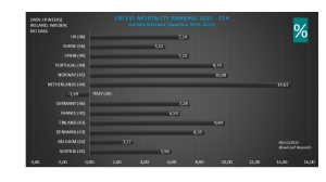 Dit is de eerste vrijwel complete EMR van 2025. Van Italië en Zweden onbreken nog de cijfers. Ierland wordt toegevoegd (dan wordt het E15, geen cijfers). De cijfers zijn op basis van 3 tot 4 maanden en geven daardoor voor het eerst een tamelijk betrouwbaar beeld van de huidige oversterfte in West-Europa, gemeten o.b.v. de baseline 2015-2019. Nederland heeft het hoogste oversterfte percentage: 8,56%. De ondersterfte van Zwitserland is opvallend: – 7,55%.