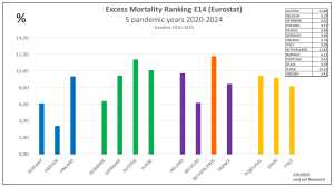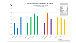 Medio februari publiceerde Eurostat de excess mortality cijfers van de EU-landen tot en met december 2024. De data zijn verwerkt in een grafiek die de gemiddelde oversterfte per land (E13) weergeeft in de vijf pandemische jaren 2020-2024 op basis van de baseline 2016-2019. Landenscore en ranking: